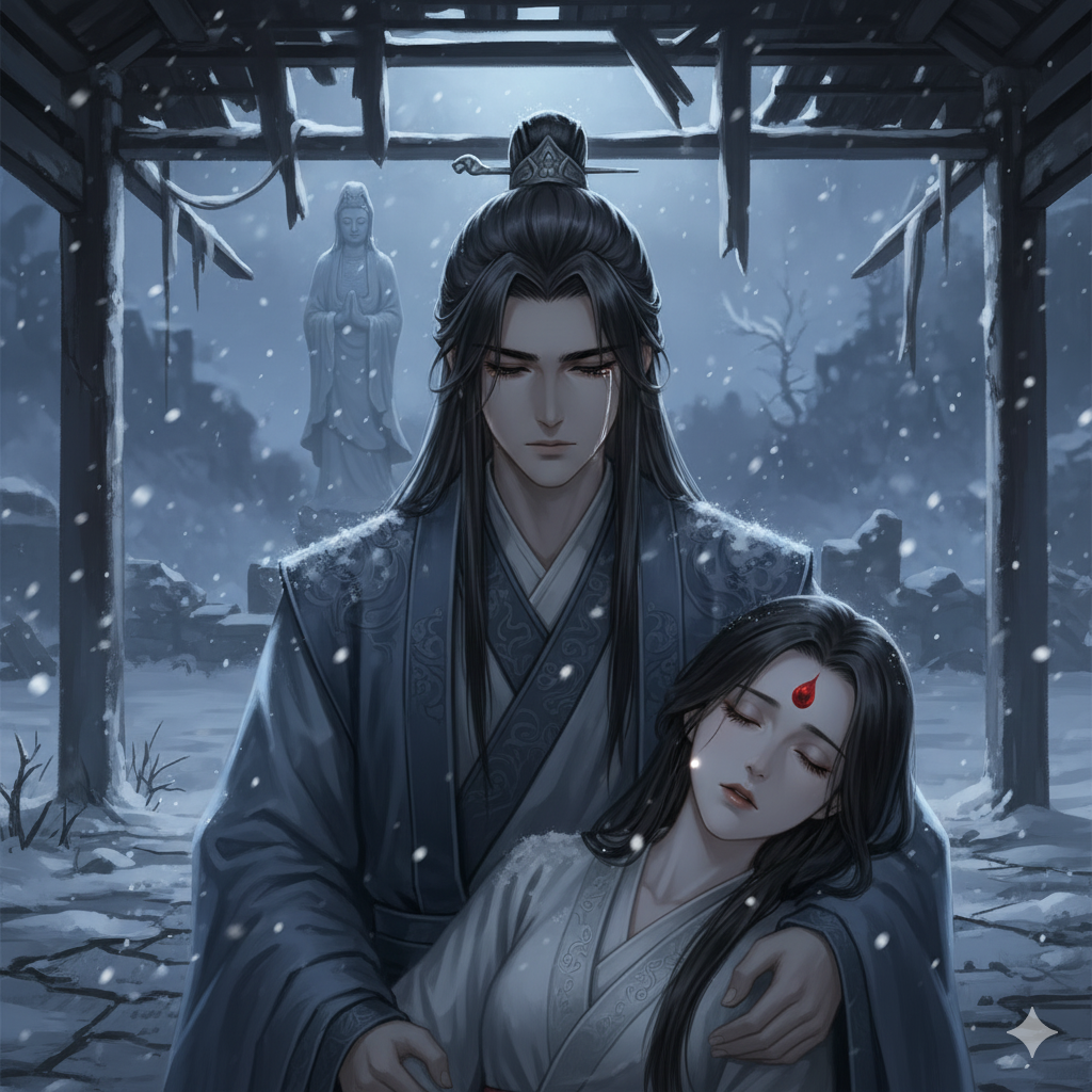 Юноша стоял на коленях перед буддийским залом. Его одежда была тонкой, явно не по сезону. Снег уже покрыл его плечи и волосы, словно он стоял так уже не один час.