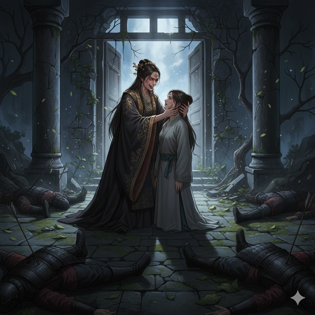 Внезапно. Холодная стрела, влетев через дверной проем, вонзилась прямо в правое плечо Мэн Чанъань. Она в ужасе вскинула голову, глядя на дверь. Люди вокруг нее, один за другим пронзенные стрелами, в мгновение ока попадали на землю.