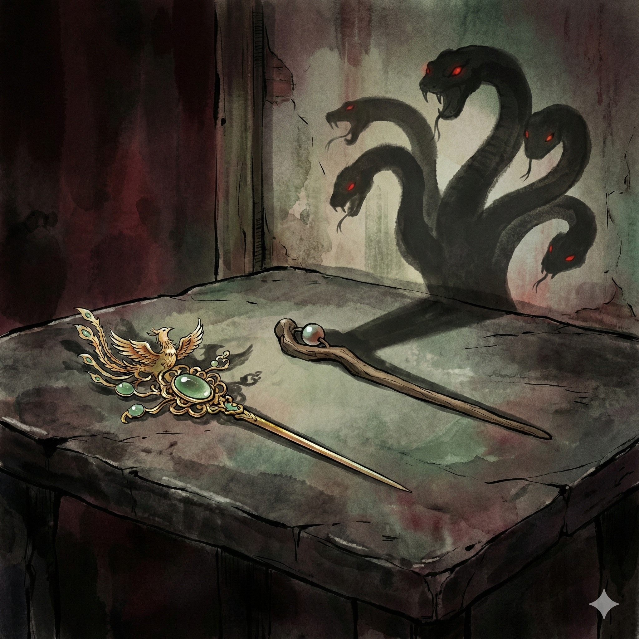 Один из слуг, который в тот день первым ворвался в молельню, шагнул вперед и, поклонившись, ответил: — Так и есть, Юная Госпожа. Когда я прибежал, я видел, что змеи, ползая, оставляли на полу мокрые следы.