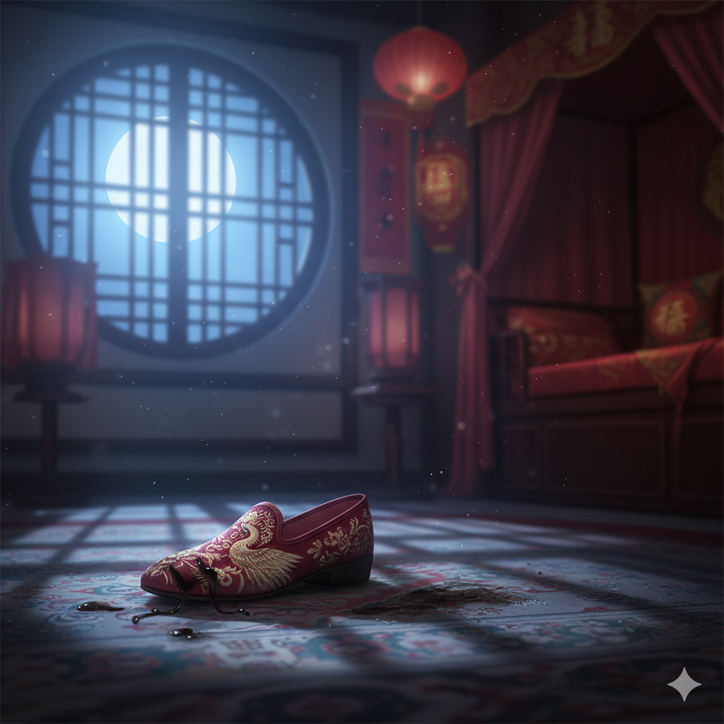 Ветер трепал угол большого алого иероглифа «Счастье», приклеенного к двери флигеля, и тот издавал непрерывный шелестящий звук. Из распахнутой двери виднелась кровать из резного красного дерева. На ней лежала красивая девушка, одетая как служанка. Увы, ее большие миндалевидные глаза безжизненно уставились в потолок. Изысканное платье было разорвано в беспорядке, а лицо и тело покрывали раны. Из-под затылка натекла темная кровь, окрасив парчовое одеяло в багровый цвет.