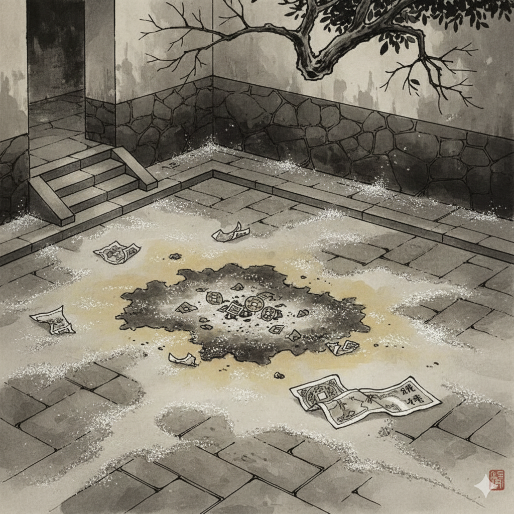 — Здесь… — проговорила она. — Кажется, здесь жгли поминальные деньги. Посмотри.
