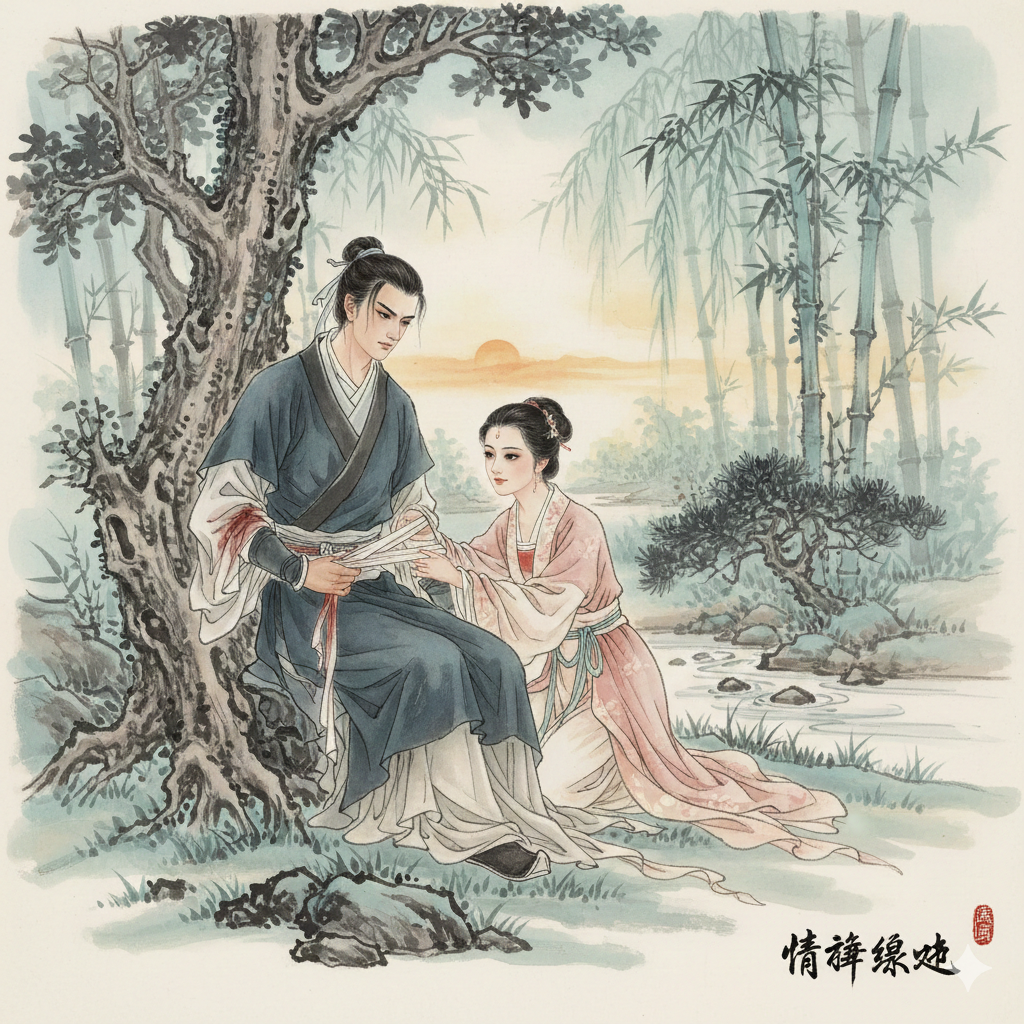 На следующий день Сяо Юньцзин медленно открыл глаза. В лучах восходящего солнца он увидел, как шестнадцатилетняя девушка, подобрав подол, стояла босиком в ручье. Золотые лучи играли в её тёмных волосах, вода журчала у её белых щиколоток. Её хрупкий силуэт, качавшийся в мерцающих бликах, казался нежным, прекрасным сном, который с этого мига навеки поселился в его сердце.