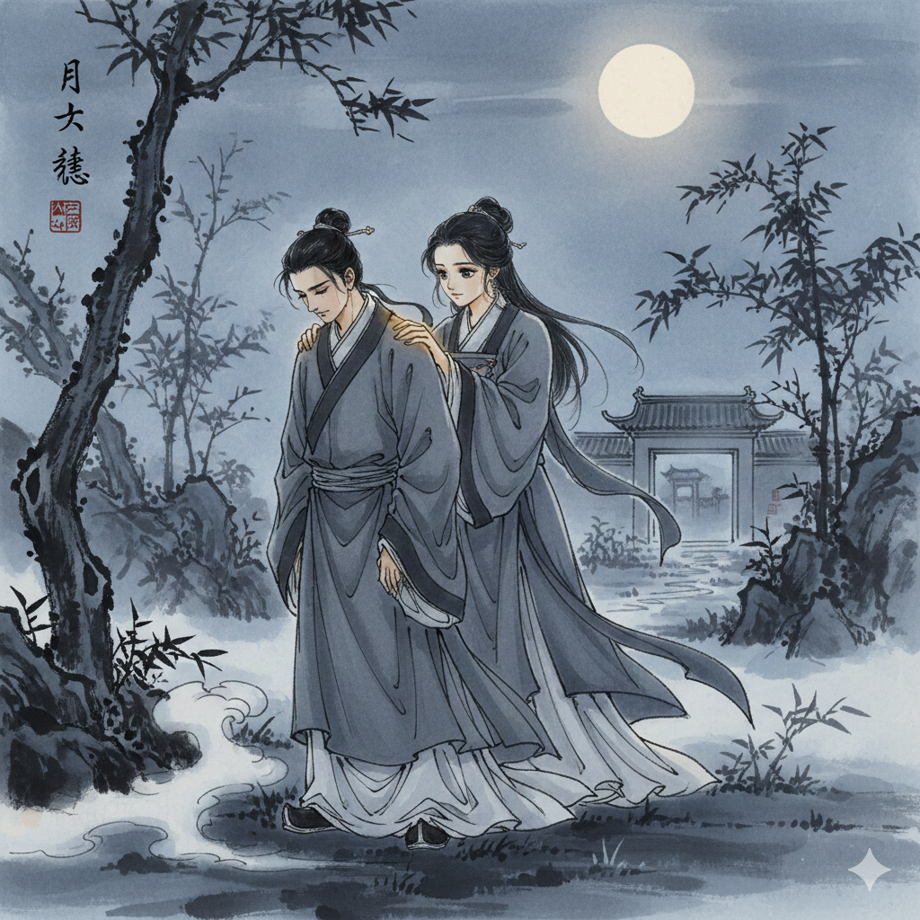 Он шёл, пока не добрёл до своих покоев. Ночной ветер пробирал его до костей, тело била дрожь. Вдруг на его плечи легли две тёплые руки. Он обернулся и увидел глаза Юаньси — нежные, полные беспокойства.